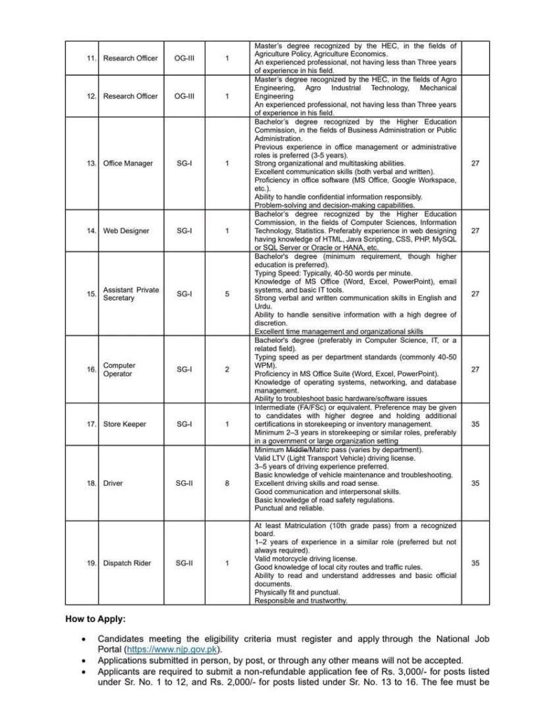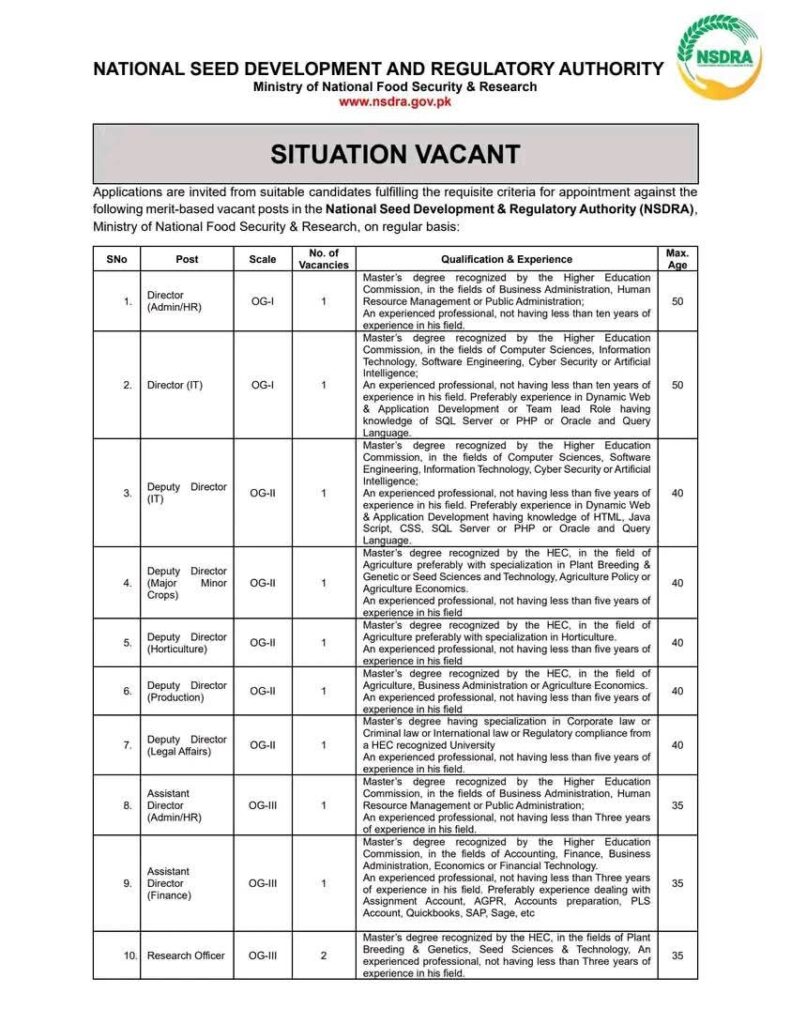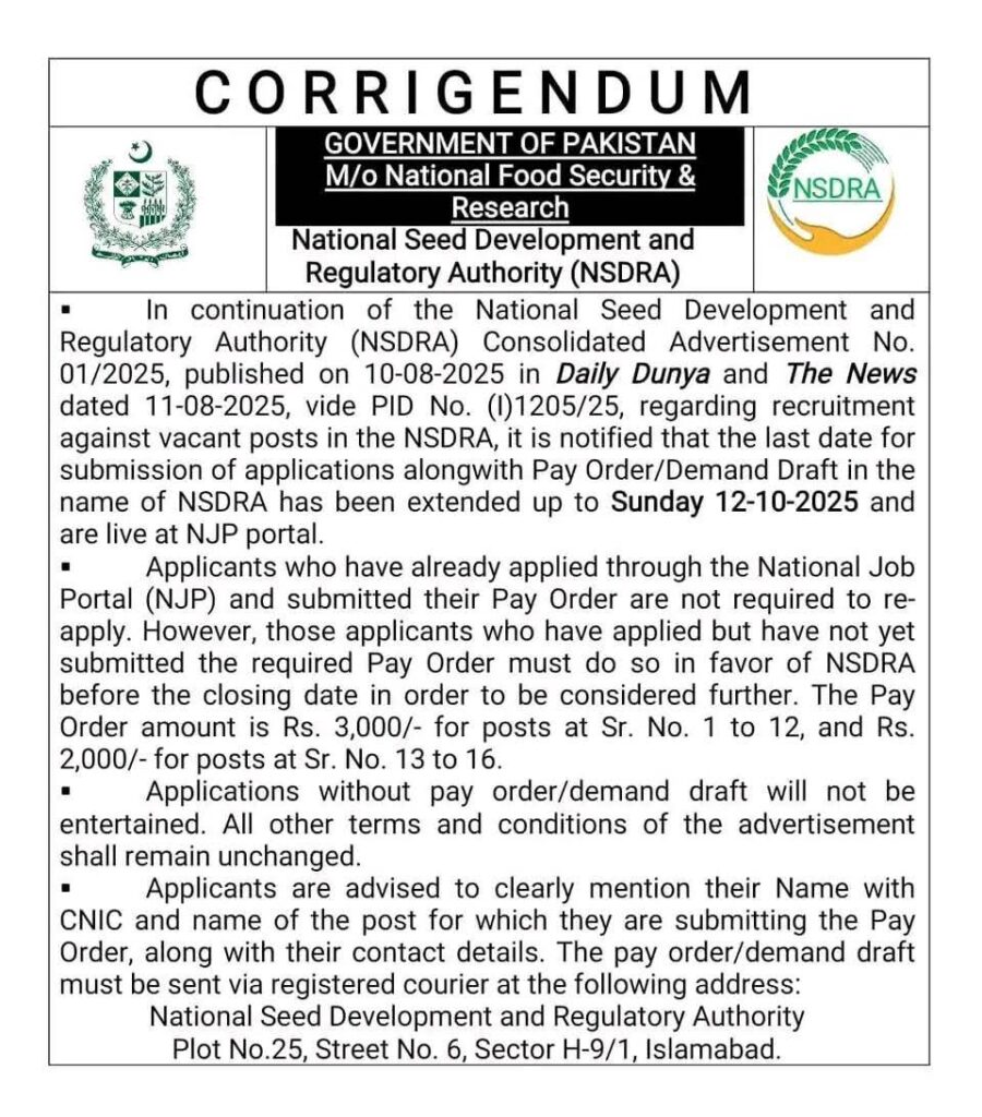 In continuation of the National Seed Development and Regulatory Authority (NSDRA) Consolidated Advertisement No. 01/2025, published on 10-08-2025 in Daily Dunya and The News dated 11-08-2025, vide PID No. (1)1205/25, regarding recruitment against vacant posts in the NSDRA, it is notified that the last date for submission of applications alongwith Pay Order/Demand Draft in the name of NSDRA has been extended up to Sunday 12-10-2025 and are live at NJP portal.